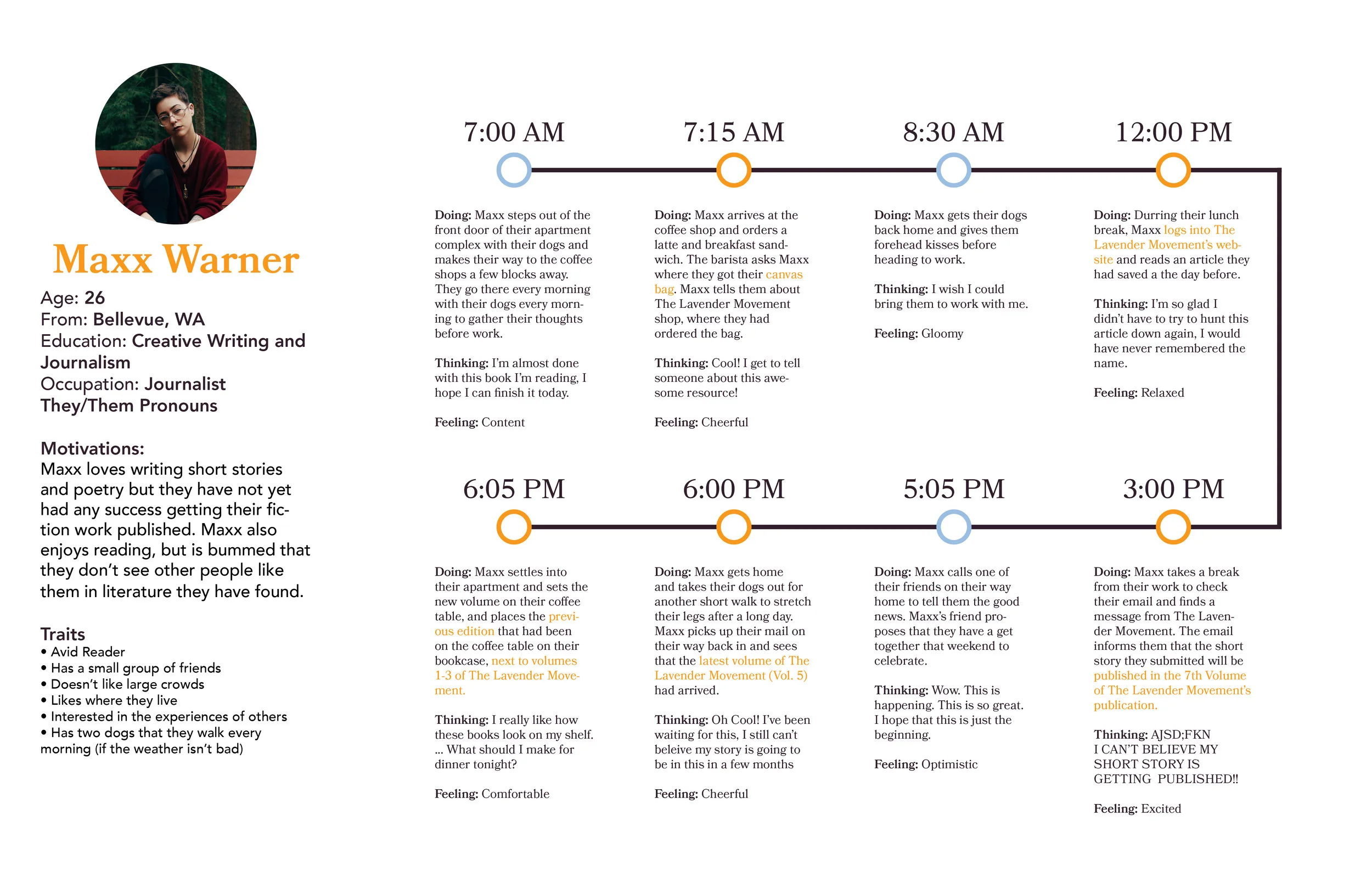 Maxx is a non-binary person who lives outside of Seattle. They found out about The Lavender Movement a few months ago, and they love it. They use the site almost every day to either read new material or submit their short stories for review. They also subscribe to the publication and has purchased a few items from the online site. Lets see how Maxx interacts with The Lavender Movement throughout their day.